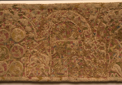 sewn with silk and gold threads, in an arcade design; and four monograms. The embroidery